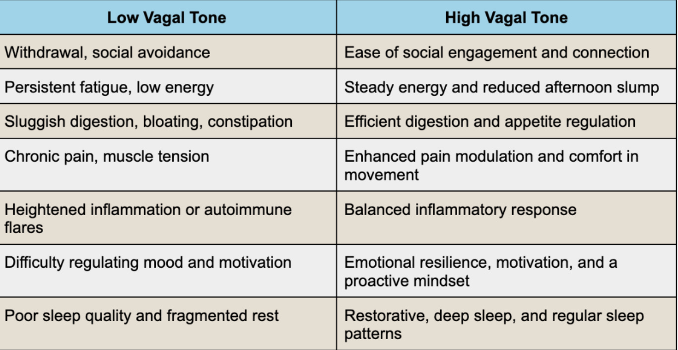 On the other hand, a low vagal tone (or inactive vagus nerve) might look like constant sickness, high reactivity and mood swings, difficulty winding down, and restlessness even after a long night of sleep.