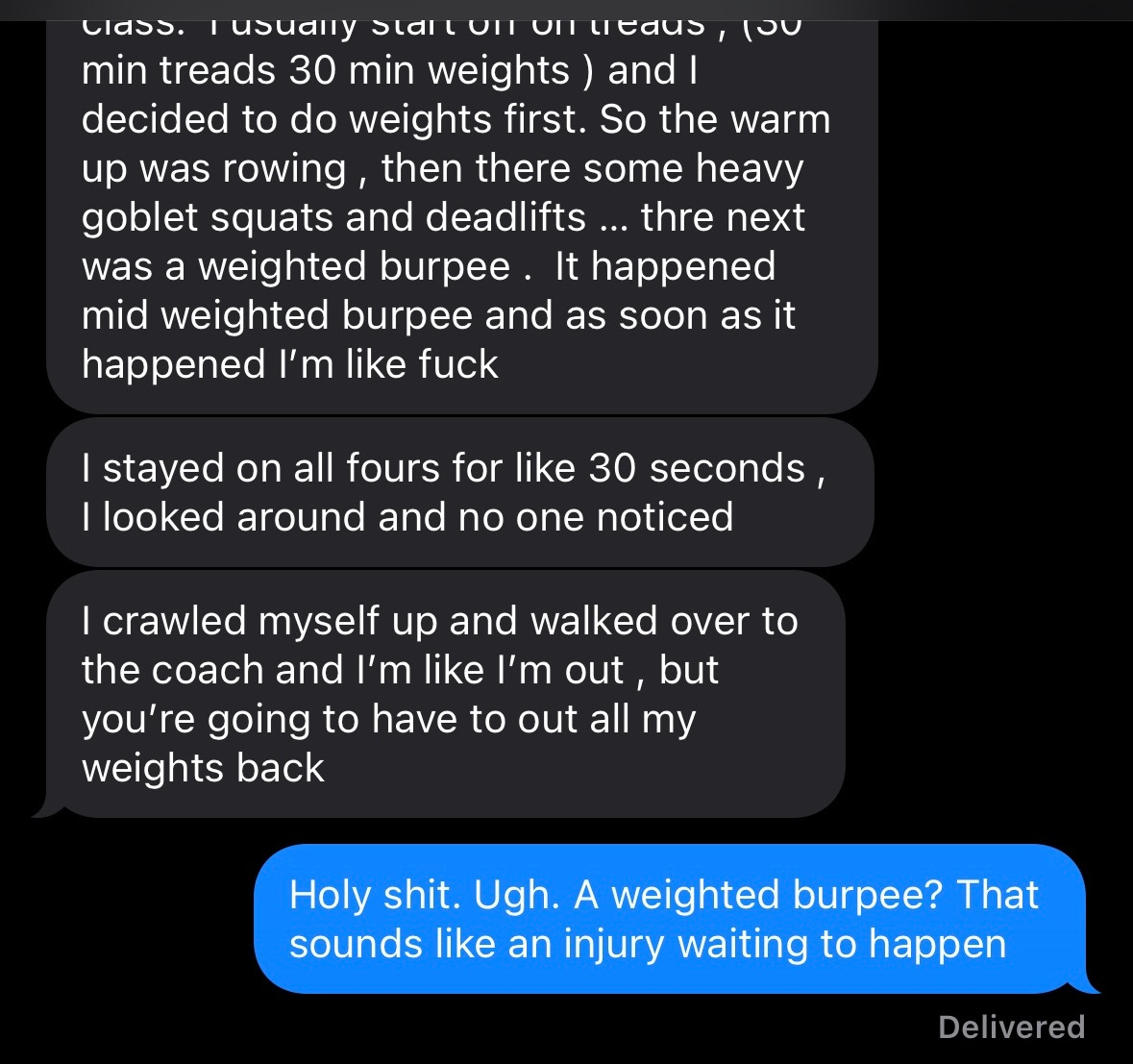 I received this text in response. Burpees are a large part of a Hyrox race and a pretty essential piece of CrossFit. Needless to say, they are a staple — an unnecessary one, at that — in many group fitness classes across the country.